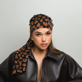 Jedwabisty delikatny turban damski w stylu wiązanej chusty z brązowym animal printem.