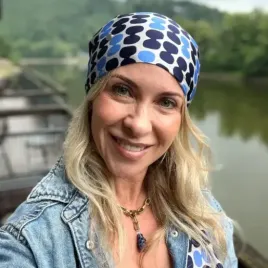 Chusta na głowę z geometrycznym wzorem idealnie komponuje się z jeansami.