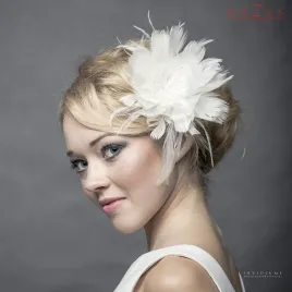 Fascynator ślubny przypominający kwiat. Wykonany z rozmaitych delikatnych piórek. Wyselekcjonowane strusie, kogucie i gęsie piórka oraz perłowe pręciki nadają ozdobie niezwykłej lekkości i zwiewności. Pięknie podkreśla romantyczny charakter stylizacji.