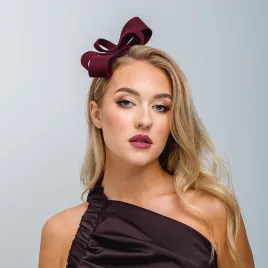 Burgundowy fascynator do włosów w postaci różnej szerokości taśmy wijącej się, kształtem nawiązujący do kokardy. Twarzowy i piękny dodatek na kobiet w różnym wieku na różne ważne okazje od studniówki, sylwestra, wesela, panieńskiego, po komunię, chrzest czy rocznicę. Pięknie komponuje się z wieloma kolorami- brudny róż, granat, czerń, złoto, beż...