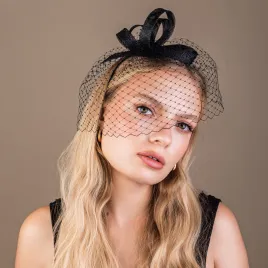 Czarna opaska do włosów z zawijasem i woalką, opadającą na połowę twarzy. Elegancki, wieczorowy produkt idealny na wyjście do teatru bądź opery. Nada Twoim stylizacją ekskluzywnego look'u!