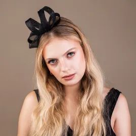 Delikatna czarna ozdoba na głowę w formie zawijasów. Wykonana została z sinamay i krynoliny. Nowoczesny i prosty stroik, który wykorzystasz na wiele okazji. W zależności od stroju może być wieczorowym jak i koktajlowym uzupełnieniem fryzury. Mocowany na czarnej, cienkiej, metalowej opasce. W całości ręcznie szyty.