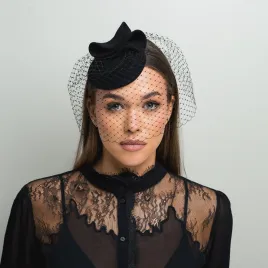 Czarne mini nakrycie głowy z woalką zakrywającą twarz.