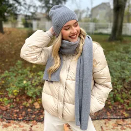 Ciepły i przemiły komplet w szarym odcieniu został stworzony w Polsce z włoskiej przędzy. Super komponują się z codzienną garderobą. Idealny i ponadczasowy dodatek na jesień i zimę do stonowanych i szalonych stylizacji.