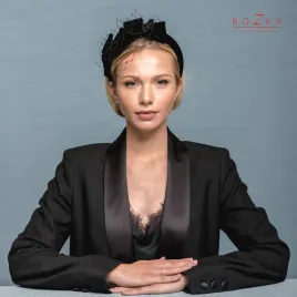 Czarna uniwersalna opaska na głowę na wiele okazji. To idealny dodatek na wieczór, na rodzinne święto i na smutne okazje. Taki nieprzesadzony czarny dodatek sprawdzi się dla młodszej i starszej kobiety. Cała opaska wykona jest z czarnego aksamitu, zdobiona zwojami czarnej taśmy i motywem grubej woalki.