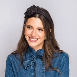 Stylowy i niebanalny dodatek do codziennych oraz świątecznych stylizacji – w czekoladowym odcieniu z delikatnym złotym połyskiem. Miękki materiał świetnie trzyma włosy, w świetle dziennym jest matowy, podczas gdy w sztucznym odbija złoto i subtelnie błyszczy. Idealna dla osób, które lubią wyróżniające, a jednocześnie uniwersalne akcenty.