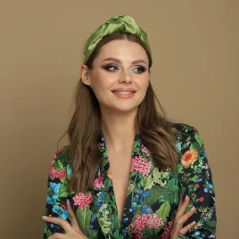 Opaska kobieca w ciekawym odcieniu zieleni, dodatkowo podbitym poprzez połyskującą tkaninę. Uszyta jest z satynowej wiskozowej najwyższej jakości tkaniny. Bardzo uniwersalna ozdoba do włosów pasująca do wielu ubrań i stylizacji.