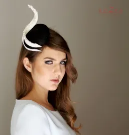 Czarny niewielki toczek z oryginalnym zdobieniem w postaci śmietanowych płomieni wijących się ku górze. Akcent pokryty ręcznie wyszywanymi perłowymi koralikami. Całość ręcznie formowana i szyta w naszej pracowni.